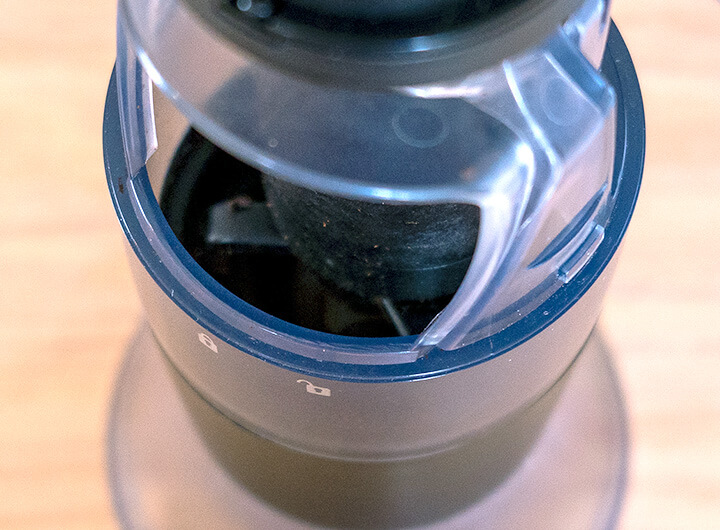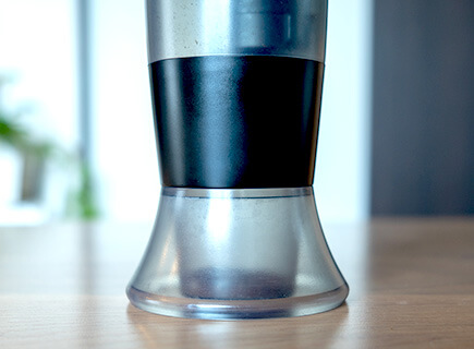 挽き方は簡単。上部キャップを外し、グラインダーの上部にある隙間から豆を入れます。キャップを閉じてボタンを押し、あとは5分間待てば下のホッパーに粉が溜まります。豆の分量や粗さ調整によって、挽き終わりの時間は多少変わります。私の場合は中細挽きくらいの設定で、3-4分くらいでした。挽き終わった後もグラインダーは動き続けますが、タイマーストップ機能が付いているため、5分経つと自動的に止まります。
