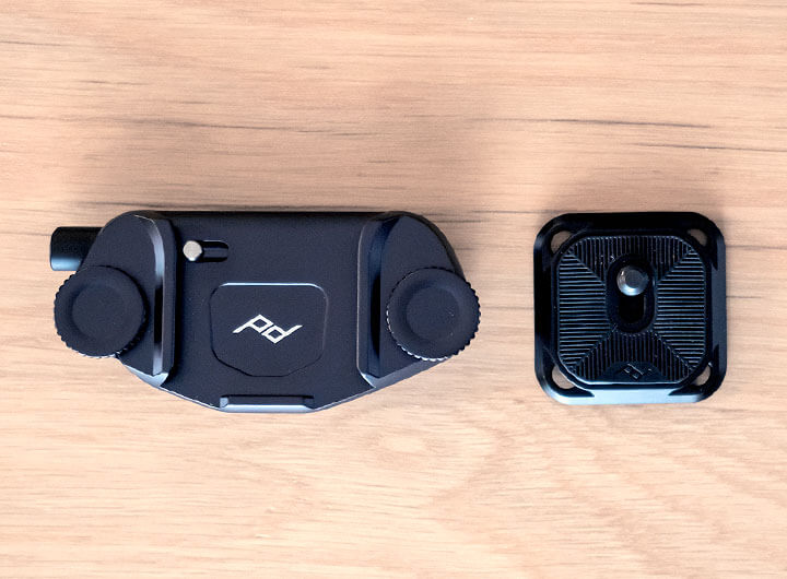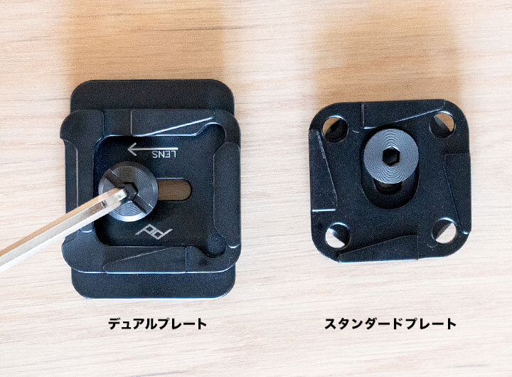 キャプチャーに付属のスタンダードプレートは、汎用性のあるアルカスイス互換です。スタンダードプレートの裏面は六角レンチで締め込むタイプなのが手間ですが、一度カメラに取り付けてしまえばと思えば妥協できます。また、別売となりますが200PL規格にも対応したデュアルプレートもあるので後述します。