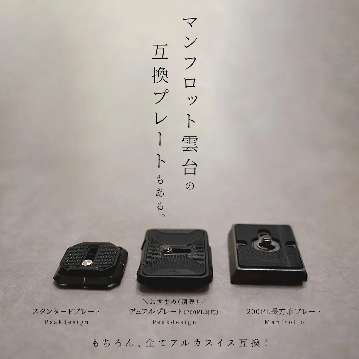 デュアルプレートはアルカスイス互換でありながら、200PLにも対応した最強のクイックプレートです!マンフロットの雲台にもワンタッチで脱着出来るのは有難いです。
