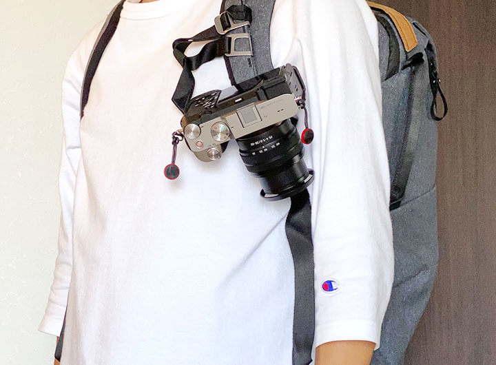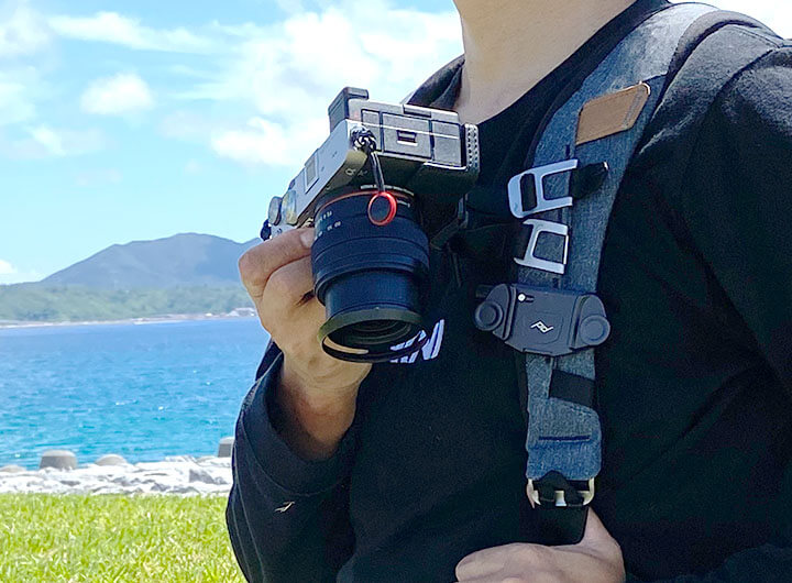 首掛けストラップだと歩行時に胸あたりでカメラが跳ねるし、ハンドストラップだと片手が塞がってしまいます。両手がフリーの状態で必要な時だけカメラを取り出し、好きな位置に固定収納出来るキャプチャーは野外撮影の頼れるガジェットです。