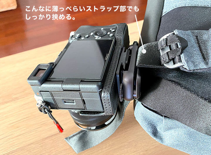 ブラケットの裏面は滑り止め加工が施されています。バッグのストラップの太い部分はもちろん、薄いテープ部分に装着してもしっかりと固定されました。試しにa7Cレンズキット(676kg)をテープ部分に装着して、横や下に引っ張ったり試してみましたが、ズレたりせずしっかりと固定されていました。