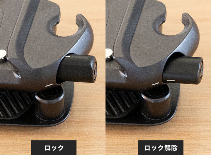 キャプチャーのロックボタンを90°回転させるとセーフティロックが掛かります。不意にボタンを押してカメラが外れてしまうことを防ぎます。キャプチャーの唯一の突起部であるこのボタンの長さは扱いやすさも鑑みた、ギリギリを攻めている秀逸な設計だと思いました。