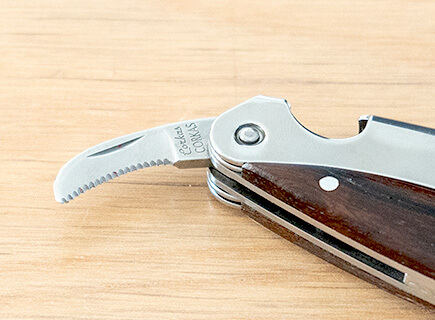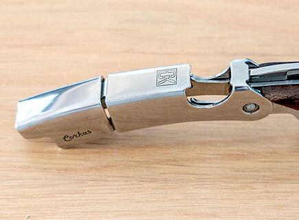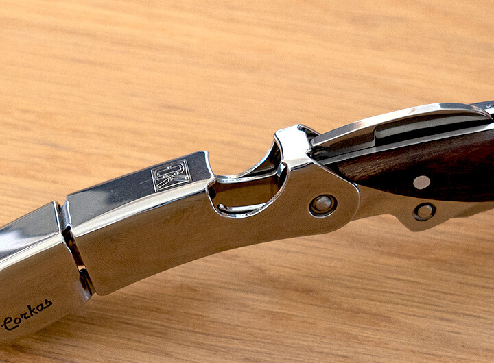 シンプルな栓抜き機能も備わっています。あいにく栓が閉まった瓶が手元にないので、利用シーンの写真はありませんが、CORKAS ソムリエナイフはステンレス製で頑丈そうな作りなので、瓶栓も簡単に開けられそうです。