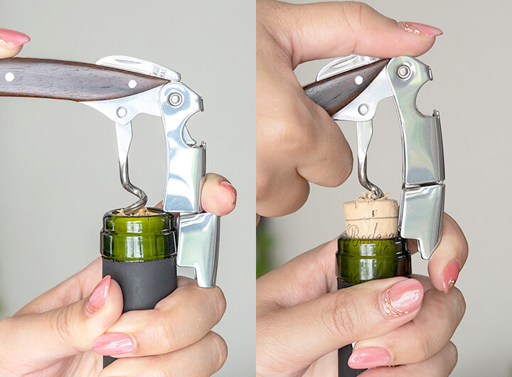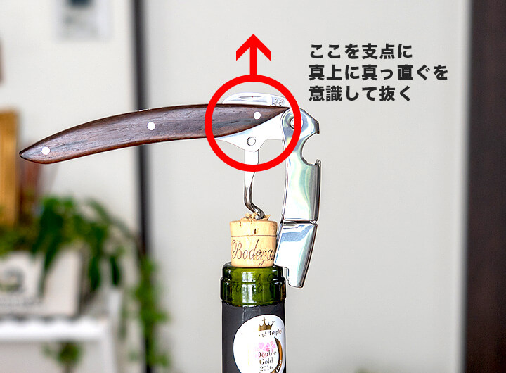 抜き方のコツとしては、フックの根本部分を支点にして、コルクを抜く時は真上に真っ直ぐを意識することです。力任せに抜こうとすると、ソムリエナイフでも角度によってはコルクが折れる場合があります。