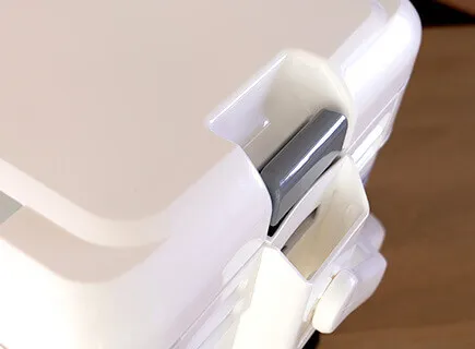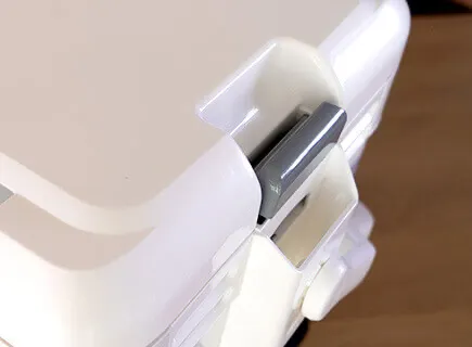 運搬時などに不意に上フタが開いたりズレたりしないよう、サイドロックでしっかり固定出来ます。二重のロック機構という訳です。