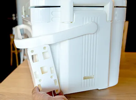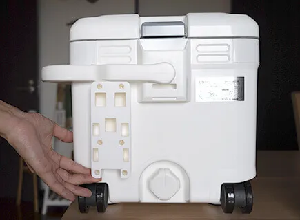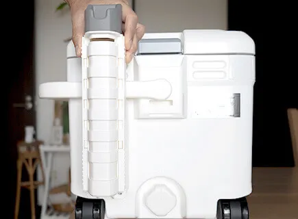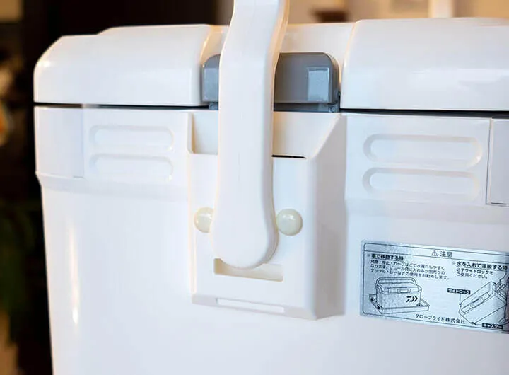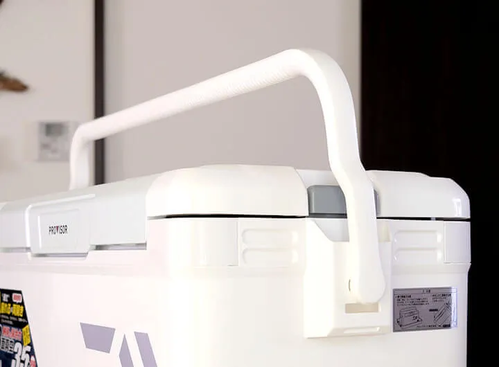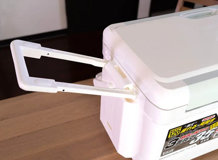 大型のクーラーなので両手持ちすることも想定して、左右側面にもちょっとした取っ手が欲しかったです。とはいえ、これ以上ハンドルを増やすのはナンセンスなので、ロングハンドルの付け根部分などに指を引っ掛ける取っ手や指先が入るちょっとした凹みがあれば、もっと利便性が上がったと思います。