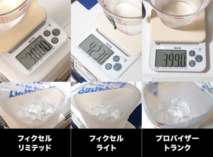フィクセル リミテッドとプロバイザートランクは同じ量でした。しかしどのクーラーも目に見えて氷が減り、フィクセル ライトは…氷のかけらが3つほど。あと1時間もすれば完全に解けてしまいそう…、私も眠い。もう少し頑張って計測していきます。