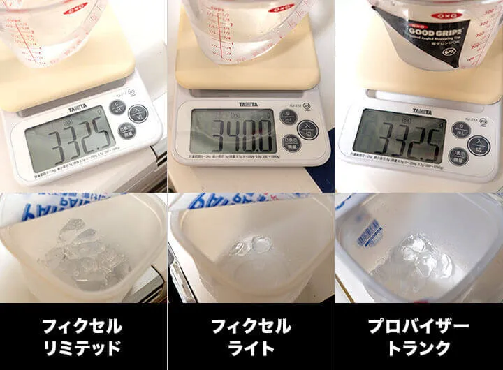 途中経過は、氷が解けた分の水の量を測りチェック。水の量が少ないほど保冷力が高く、水の量が多いほど保冷力が低いという判断指標。