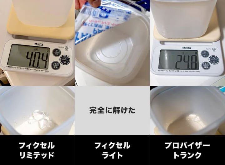 クーラーの容量的にひょっとしたらプロバイザートランクが最下位かな、と予想していましたが意外な結果でした。氷は半分くらい残っていました。クーラー内の防水プルーフケースが保冷維持に貢献してる気がします。また、フィクセル ライトも意外で、もっと解けていると予想していましたが、健闘しています。