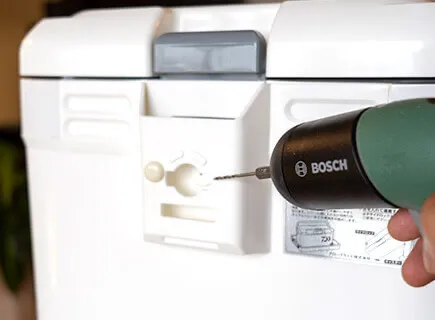 取り付け位置を決めたら両面テープで仮止めし、専用ネジで固定します。クーラーの外装は硬いので、ネジ留めは少し力が入りますので慎重に行いましょう。