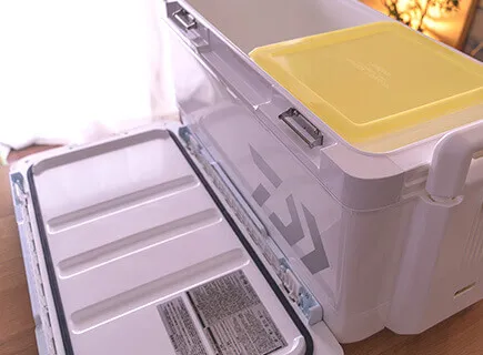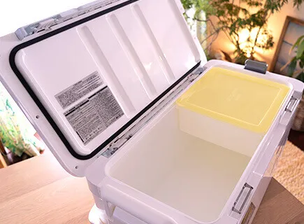 プロバイザートランクHDⅡのTSS(3面真空)とZSS(6面真空)には防水プルーフケースが付いています。深さもあるので、お弁当を入れるのにちょうど良さそう。クーラー内でスライド移動も出来るのがいいですね。