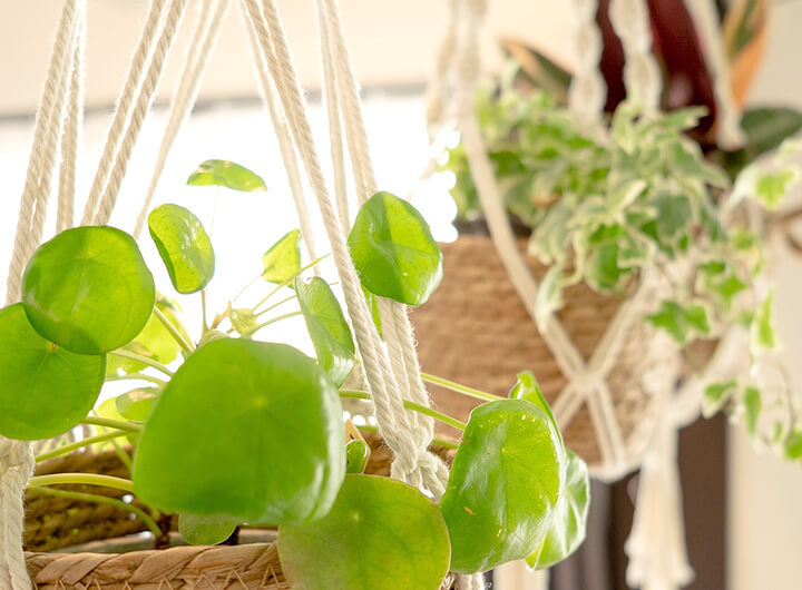 3号鉢くらいのサイズになると、それなりに存在感もありインテリア性も増します。手頃に色々な植物にチャレンジするにもちょうど良い大きさで、カーテンレールや壁掛けで飾るハンギングもおすすめです。グリーンネックレスや、アイビー、ポトスなど、つる性の観葉植物が定番ですね。