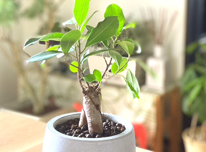 観葉植物として定番になってきたガジュマル。「多幸の木」「幸せを呼ぶ木」と呼ばれ、沖縄ではキジムナーという精霊が宿る木とも云われています。土からはみ出るくらいに、ぐにゃりと曲がった太い根っこが特長的な植物です。こちらもパキラ同様に丈夫で強い植物ですので、初心者でも管理しやすいです。うちのガジュマルにもキジムナー住んでないかなぁ。