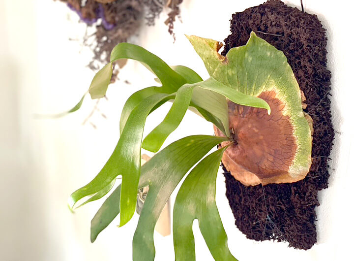 お洒落なカフェやバーにも飾られており、一つ飾るだけでもクールでカッコいい印象になります。大きな個体は高価なので、まずは小さな苗からチャレンジしてみると良いでしょう。苗はある程度成長したら、下の写真のようにへご板や杉板に貼り付けて(水苔が落ちないように釣り糸でぐるぐる巻きにする)、壁に掛けて飾ります。