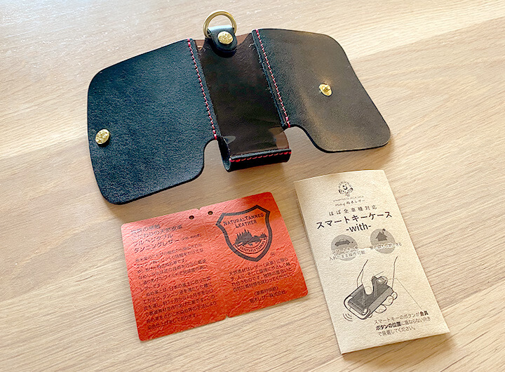 開封したら、スマートキーケース本体と説明書が入っています。新品なので革もハリがある状態ですね。触り心地やグリップ感も良い、上質なオイルレザー。これが使い込むほど味わいが出るのか〜と思うと経年変化も楽しみです。