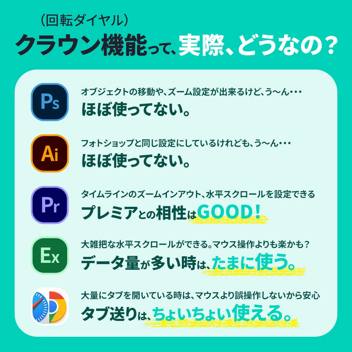 また、これは個人差があると思いますが、私は実際のところクリエイティブ系アプリではクラウンをあまり使用していません。コンテキストメニューもカスタマイズ出来たら良かったのですが、規定のメニューしか設定出来ません。ただ、前述したブラウザのタブ送りとアプリ間ナビゲート、Premiereのタイムラインコントロールは非常に便利なのでよく使ってます。この3つの機能だけでも作業効率が上がるので、クラウン機能はある程度満足しています。クラウンはあったら便利だし、なければ無いでもまあいいか、という印象です。