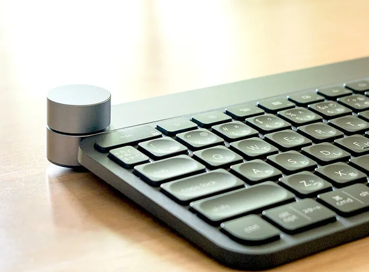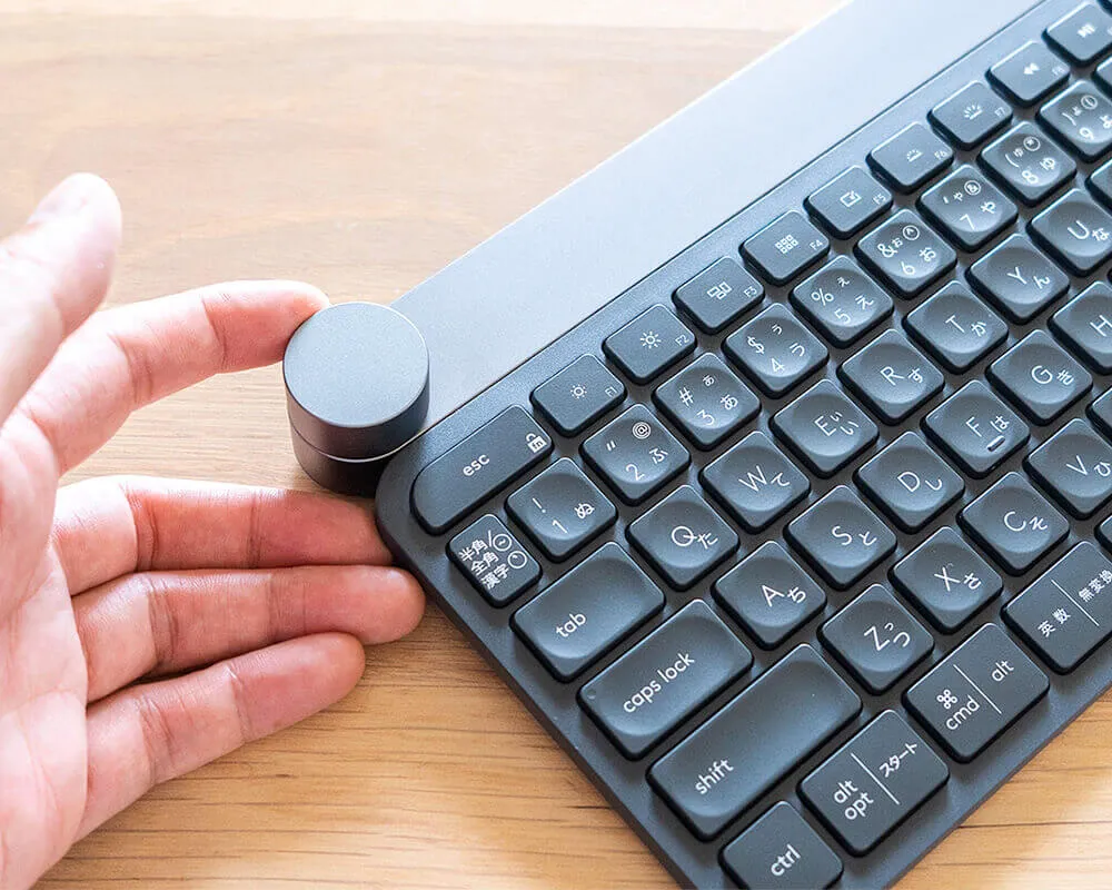 CRAFT(クラフト)の特長はキーボードの左上に搭載されたクラウン機能。ダイヤルをクルクル回せば、アプリの切り替えやブラウジング中のタブ切り替えが簡単で便利です。また、クリエイティブ系アプリとも連携していて、Photoshopやpremiere、Excelなどを使用中にダイヤルを回すと、作業に合わせたクリエイティブコントロールを行え、効率UPになります。打鍵感も悪くないし、キーボード全体の質感も上質です。