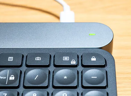 充電状態はキーボード右上のランプの点滅速度でチェック出来ます。満タン時は緑のランプがゆっくり点滅し、充電が足りない場合は点滅速度が早いです。充電が十分な時はランプは点灯しません。