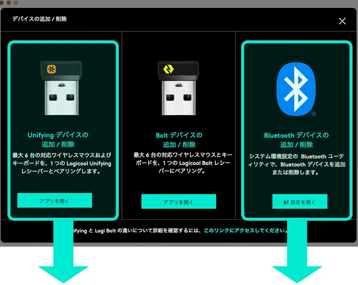PCとの接続方法は3種類あります。ここでは付属のUnifying(USB-A)レシーバーと、Bluetoothでの接続例を紹介します。Unifyingの場合、PC側にUSB Type-Aの受け口が必要です。Type-A端子がない場合は別途USBハブを用意する必要があります。また、USB3.0(2.5GHz帯)や無線LAN(2.4GHz帯)が近くにあると、干渉して接続不調になる場合もあるようです。UnifyingかBluetoothかは、ご自身の環境に合わせて感度の良い方で接続してください。機器の接続設定はlogi Optionsの管理画面で選択します。