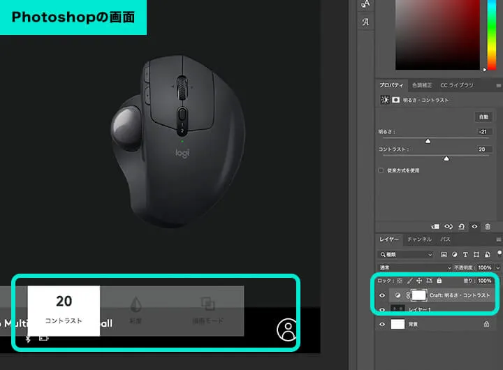 Photoshopを例にすると、ダイヤル回転に「コンテキスト」を割り当てておくと、明るさ・コントラスト・彩度・描画モードといったPhotoshop専用のメニューが展開されます。ダイヤルを回すと、各メニューの数値を繊細に編集出来ます。個人的にはPremieremのタイムラインコントロールが便利で作業が捗りました。クラウンでタイムラインを進めたり、戻したりすることが出来ます。