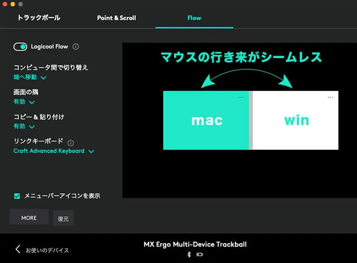 Logicool Optionsの中で最も便利な機能の一つLogicool Flow。多数のデバイス間をシームレスに操作出来る機能です。