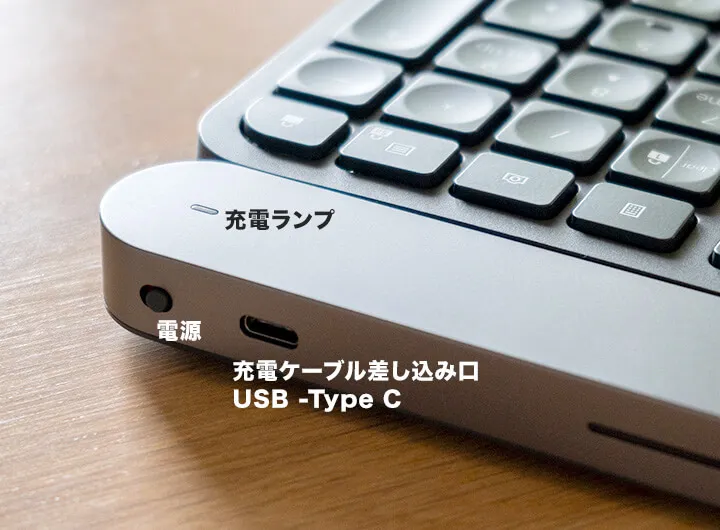 充電は付属のケーブルを使ってキーボード裏面のUSB Type-Cで行います。Type-Cです!(嬉しい)MX ERGOはmicro USBなので、そこだけ不満なんですよね…。