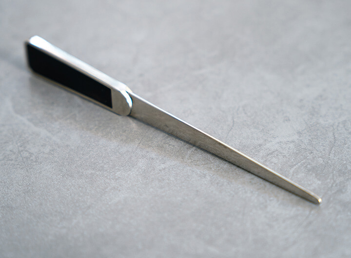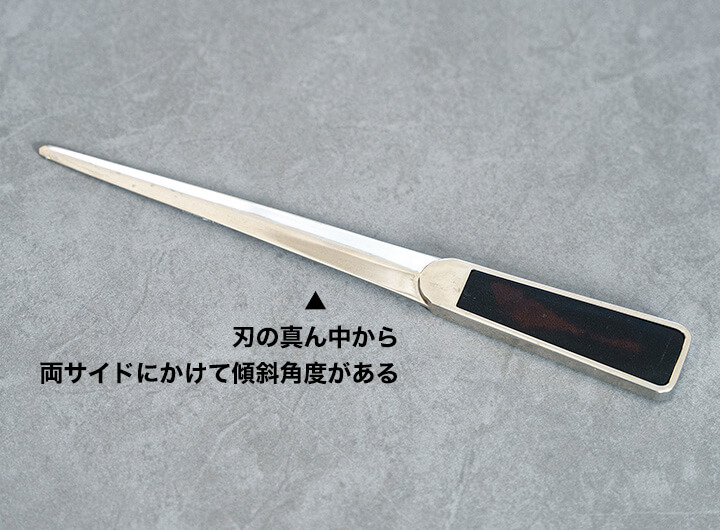 その点、レターオープナー・ペーパーナイフは刃面が少し傾斜している設計なので、封筒の折り目に沿って真っ直ぐ切りやすいんです。この傾斜角度が封筒の折り目に対するガイド代わりになっているんですね。実用性が高いです。
