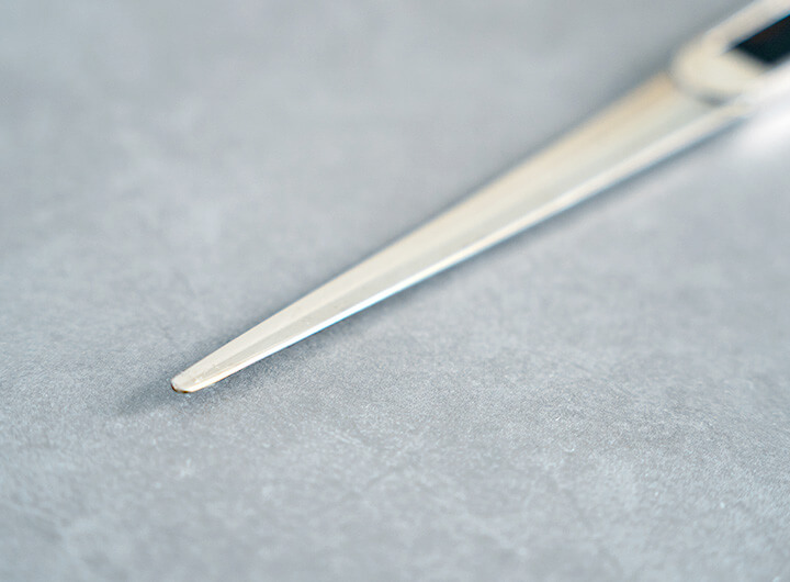 金属部分の材質は亜鉛合金と記載がありました。さらにクロムメッキ仕上げで、このなめらかなツヤが出ています。粘着性の強い封筒の開封すると、メッキ部分に接着剤のベトベトが付いてしまうことがあるので、刃についた汚れは定期的に拭き取りましょう。