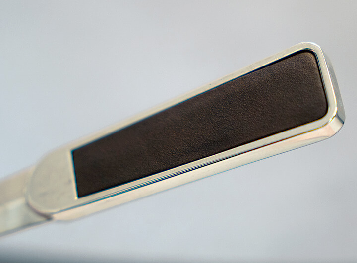 イタリアンオイルドレザーをグリップ面に貼ったデザインで、ツルッと滑ったりはしないです。製品の厚みや長さも扱いやすいサイズ感で、この革貼りは滑り止め効果にもなっているし、金属面とのコントラストも素敵なデザインになっています。