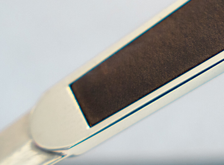 スリップオン(Slip-On)のレターオープナーのデザインの売りは、クロムメッキとイタリアンレザーのコントラストです。天然革の部分があると、温かみというか味わいが出るし、机上の文具としても高級感が増します。自己満足の世界ですけどね。筆者が購入したカラーは「チョコ」なので、写真だと革の質感が少し分かりにくいですが、他にもレッドやネイビー、キャメルといったカラフルなカラーラインアップがあります。