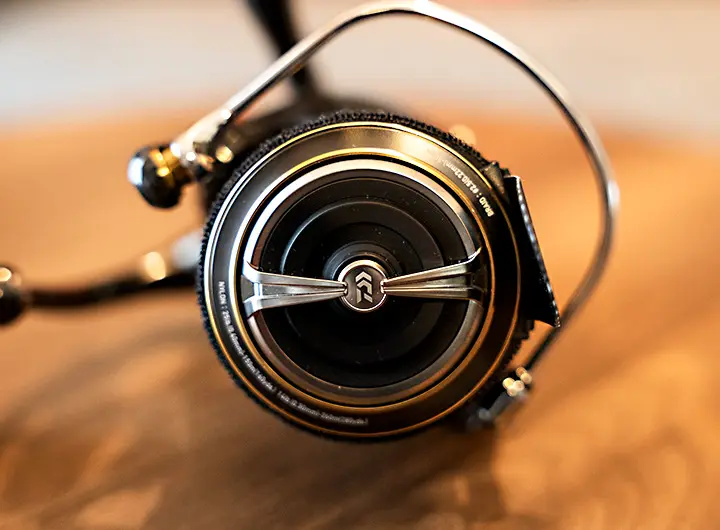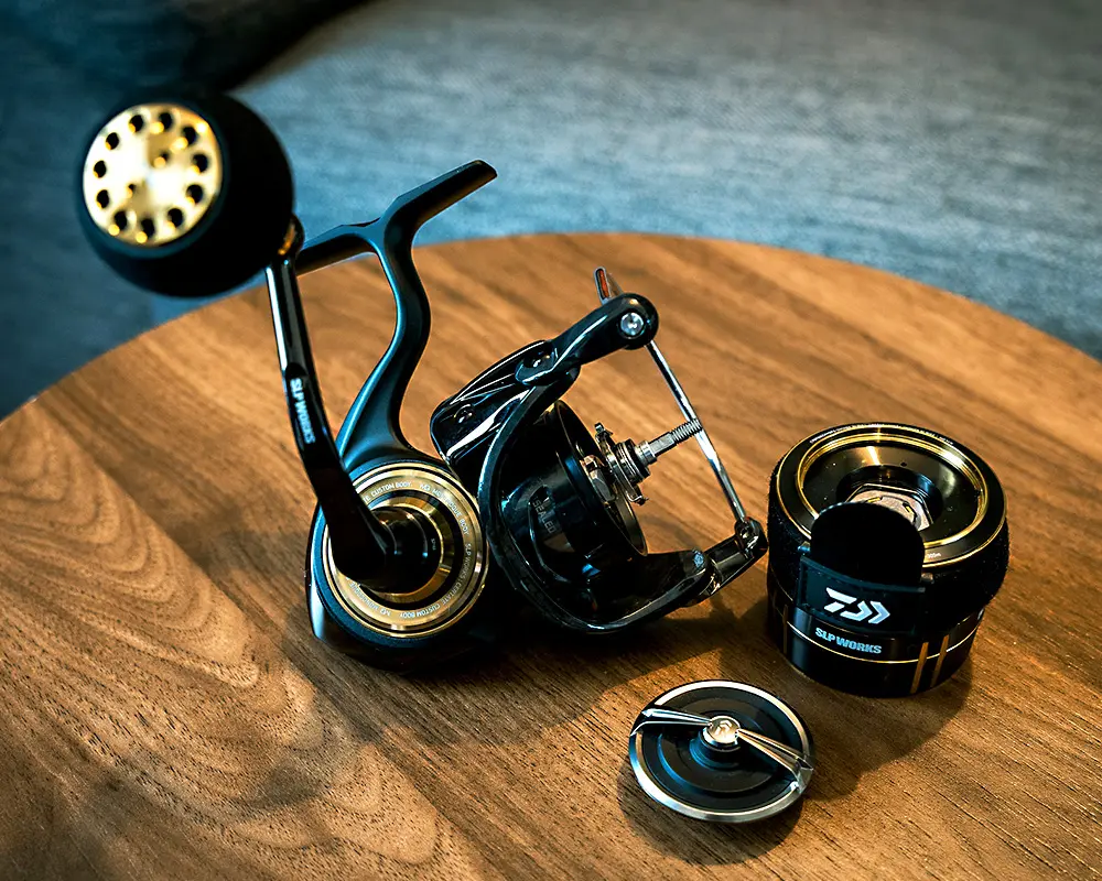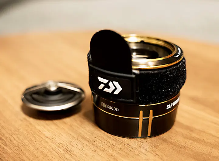 マットブラックのカスタムボディに合わせてブラックのスプールで配色に統一性を持たせました。ゴールドは控えめです。このスプールはステンレス製スプールリングに、1CRBB、ATD、LC-ABS、パーフェクトラインストッパーを装備しています。スプールリングがチタンではないのが少し残念ですが、ステンレス製でも十分なタフさはあるでしょう。また、2本線の切り出しデザインは穴が空いているわけではないので、ソルティガのスプールと同様に防水性も高そうです。