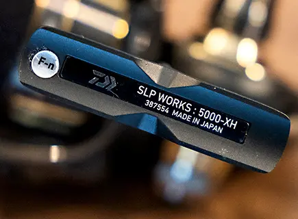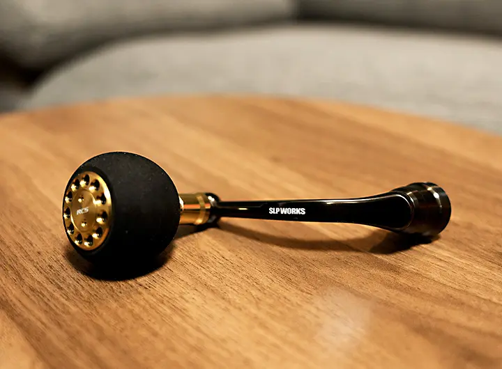 アルミマシンカット製の剛性感のあるハンドルアームです。アーム部にSLP WORKSと印字されています。ハンドルアームもブラックにすることでデザインに統一性を持たせました。65mmという長さも魚とのファイト中に軽い力でグングン巻いて来れそうで期待してます。