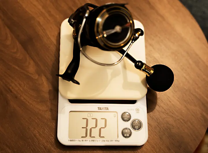 スプール、ハンドルアーム、ハンドルノブを取り付け、ラインを200m巻いた状態の総重量は322g。5000番台のリールにしては軽量で、セルテートカスタムボディの巻き味とデザインも相まって、軽快なのにタフさを感じるデザインに仕上がりました。