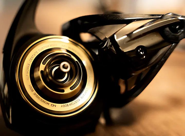 セルテート カスタムボディ SLPWの基本スペックは19 セルテートをベースとしつつも、BB(ボールベアリング)の追加や、通常のセルテートとは一線を画すマットブラック&ゴールドのカラーリングで、オリジナリティのあるデザインに仕上がっています。BBの数はノーマルセルテートの10/1に対し、スプール受けに1つ追加されたため、11/1(カスタムハンドルのBB含む)となり、さらにドライブギア部のBBがマグシールド化され、防水性能も向上した仕様です。よりタフにより軽快にを表現した思考のリールです。