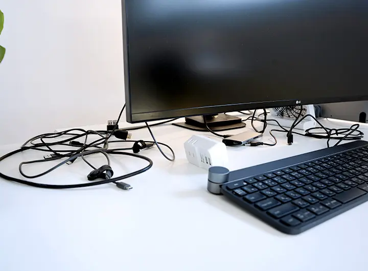 筆者はたまに在宅ワークすることもあるのですが、会社用パソコンの接続の時ばかりはケーブルがデスクに出てしまいます。仕方がないことだし、接続頻度は多くないので許容範囲としています。