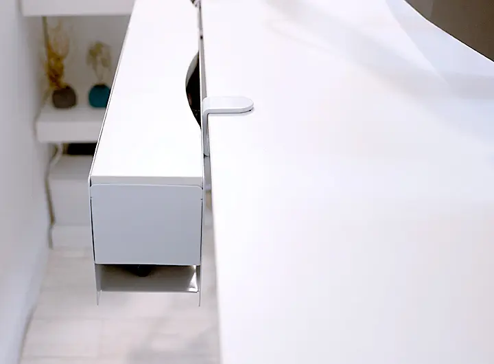 天板と同色なので遠目からは目立たないが、デスクに座ると気になる