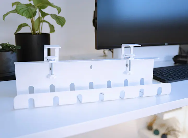 ちなみに、デスクの足やディスプレイ裏にはこのようなケーブルクリップも使いました。黒と白Verを持っておけば、色々なシーンで使えて便利です!