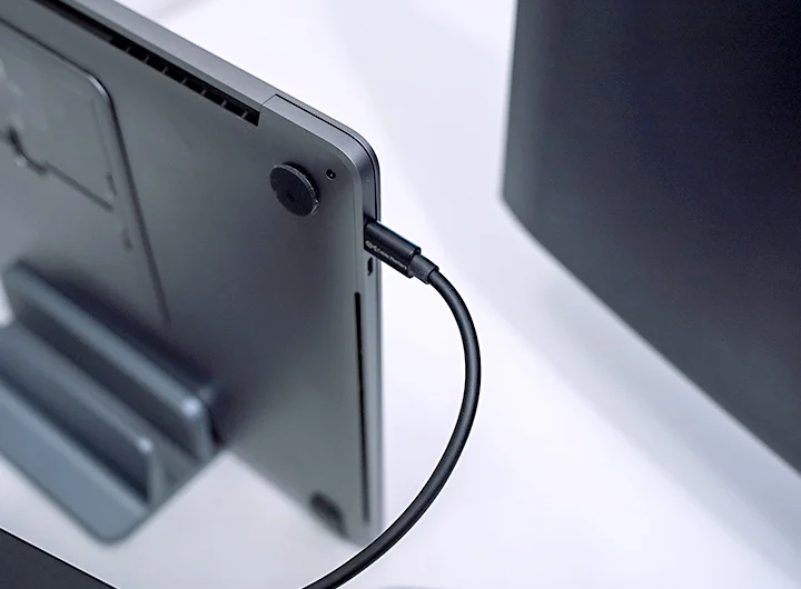 筆者がCalDigit TS4を選んだ理由が他にもありまして。それはホストマシンとの接続ポートが背面に付いていることです。もしもポートが本体前面に付いてたら、ケーブルはデスク上に出しっぱなしになり、せっかくの配線整理が台無しになってしまいます。