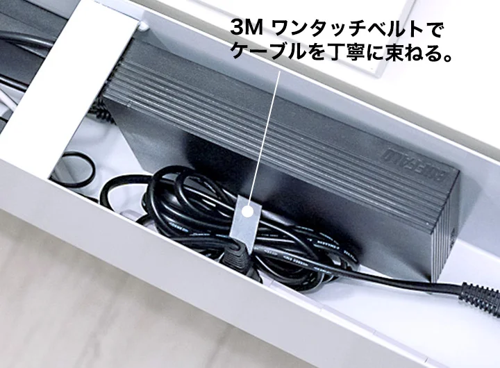 そこで役立つのが3M ワンタッチベルト。束ねたケーブルの太さに合わせて、ハサミで好きな長さに切って使います。再利用もできるので経済的!代用品としては100円ショップで売ってる結束バンドでも良いかも。
