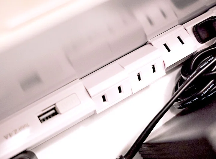 役に立ったのが角度を変えれる電源タップでした。1口ごとに角度を変えるし、USBポートも付いているからなかなか便利。