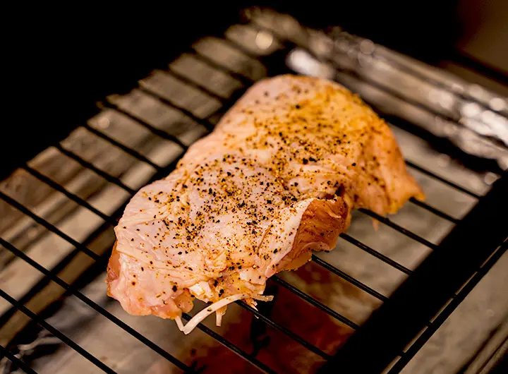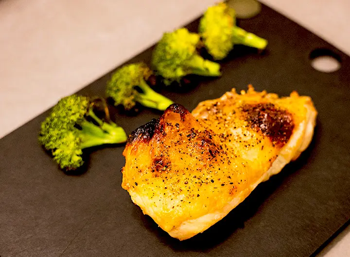 魚だけじゃなく、もちろん肉もいい具合に焼けます。設定はオートメニューの「とり肉」を選択してスタートするだけ。焼き具合は「強」にしました。焼く前にスパイシーな胡椒をたっぷり振りかけて焼き開始。