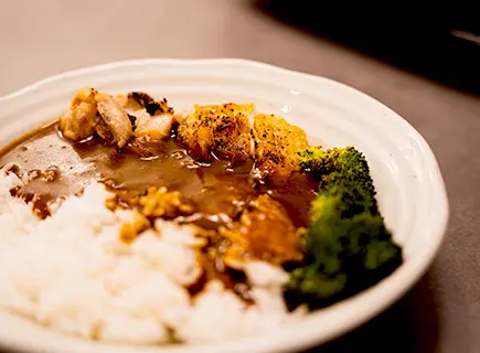 晩御飯のレトルトカレーが、少しリッチなカレーになりました。とり肉も外はパリパリッ!中はジュワッとやわらかい!一緒に焼いたブロッコリーも香ばしくておいしかったです。