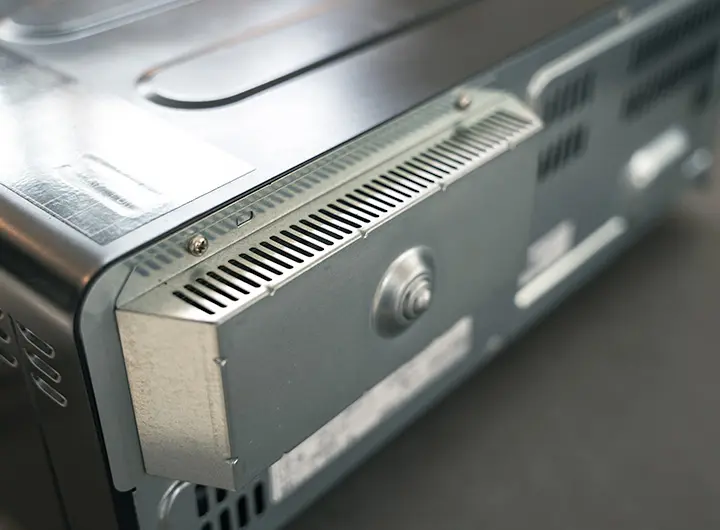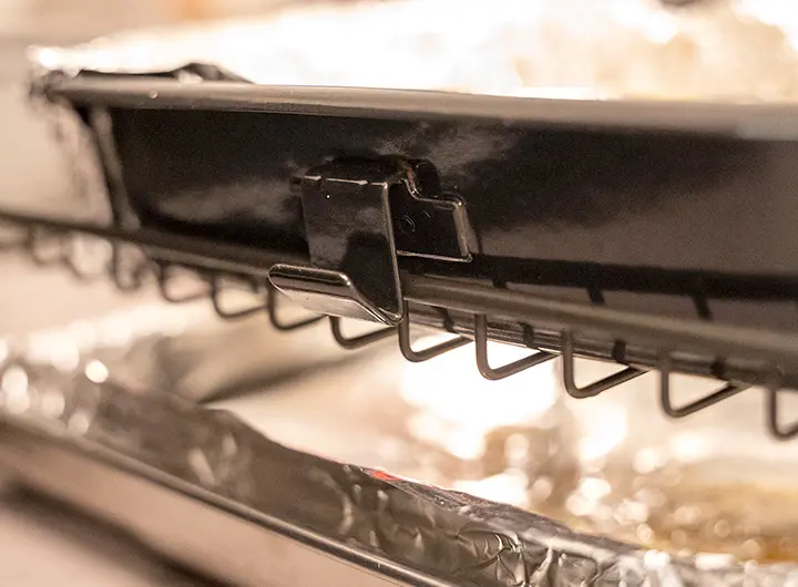 また、くんせい容器の後ろには焼き網に引っ掛ける突起が付いています。ここに引っ掛ければガラス扉をスライドして開けたときに、食材やウッドチップが飛び出さない仕組みです。