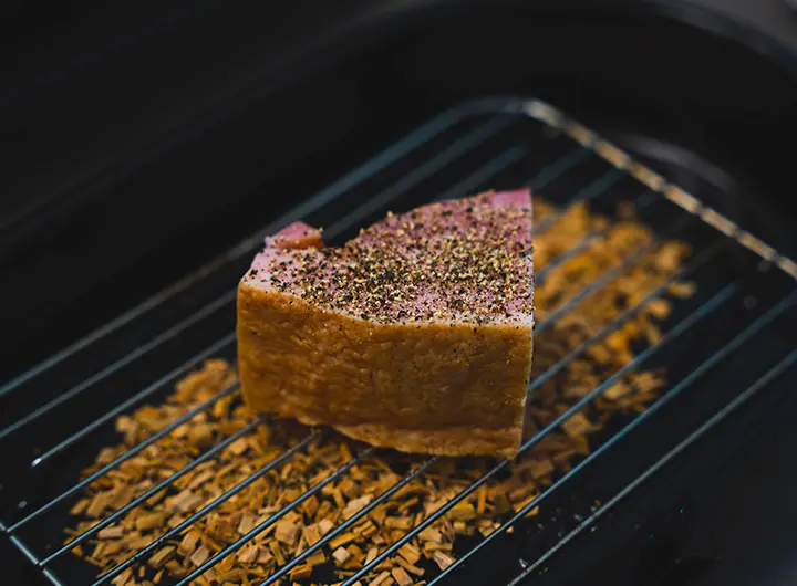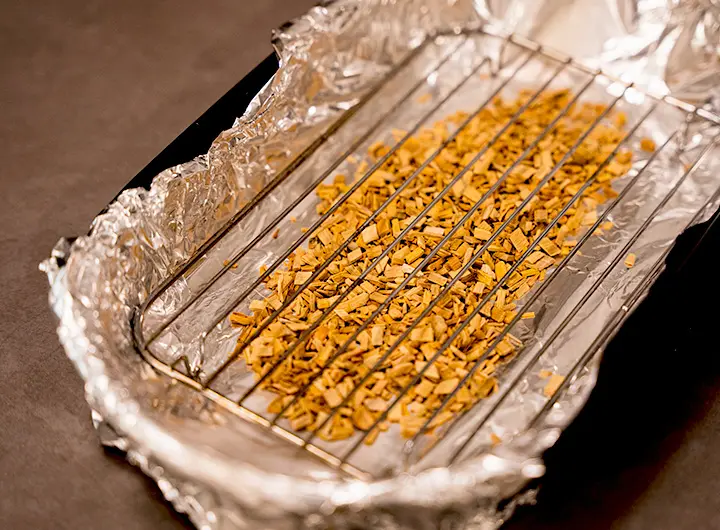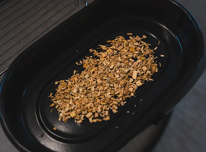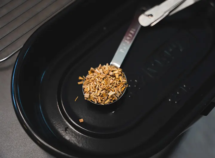 燻製の時は、付属のくんせい容器とくんせい網を使います。お好みのウッドチップをくんせい容器内側の円に沿ってまんべんなく広げます。大さじ一杯15gが目安です。ベーコンは強めに燻したいので、20〜30gほど入れました。