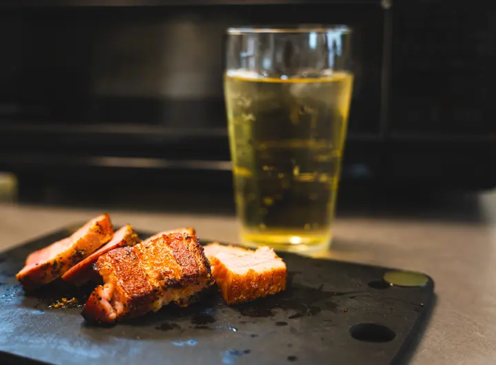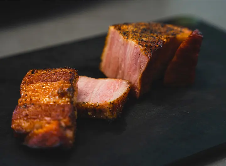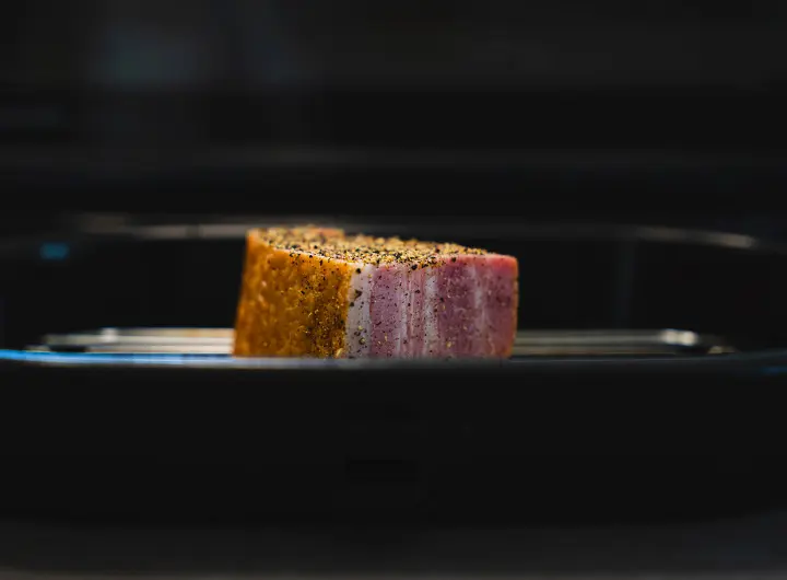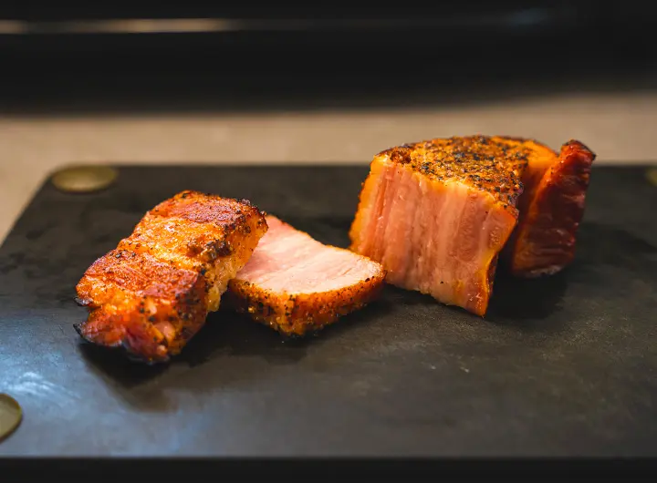 燻製ベーコンの出来上がりはこちら。ガラス扉をスライドしたら、おいしそうな薫香が漂います。胡椒も燻されて食欲そそる香り。