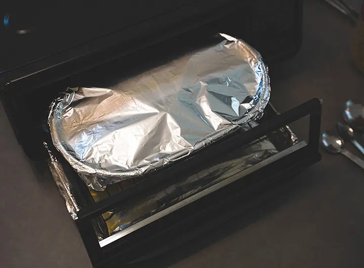 燻製をつくるときは、くんせい容器の上からアルミホイルを被せます。けむらん亭の中はこんな状態です。この構造で燻すと洗いものが楽ですよ。