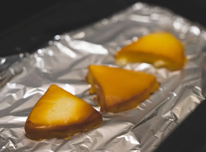 けむらん亭に記載されてるレシピに従って、プロセスチーズ(しっかり)の燻製を作ってみます。設定は「強め」モードで「15〜17分」。13分で取り出した出来上がりはこちら。