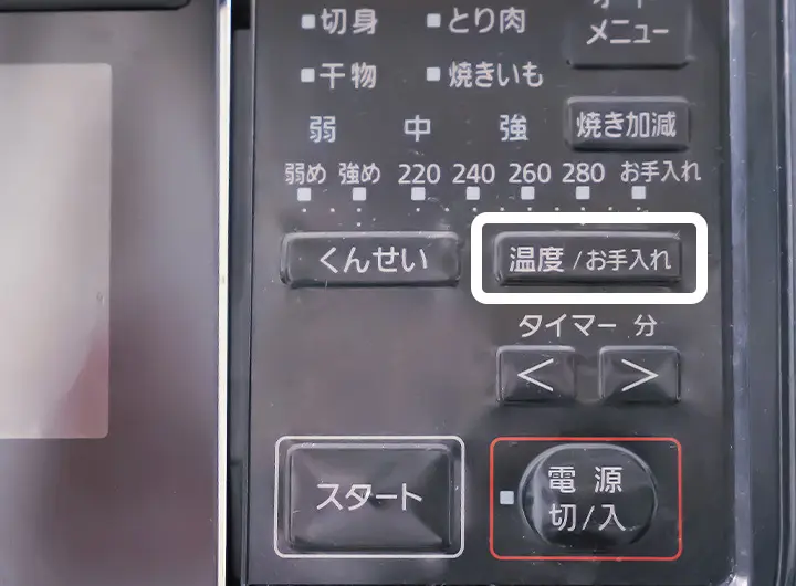 けむらん亭にはお手入れモードがついています。ヒーターにこびりついた食材の脂やコゲを焼き切って汚れを落としてくれます。お手入れは20分ほどで終了します。けむらん亭を何回か使ったあとは、下の画像の白枠のボタンを押してたまにお手入れしましょう。