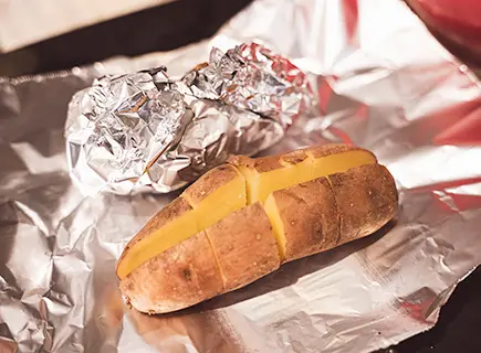 - ジャガイモを十字にカットし、アルミホイルに包み、けむらん亭にIN