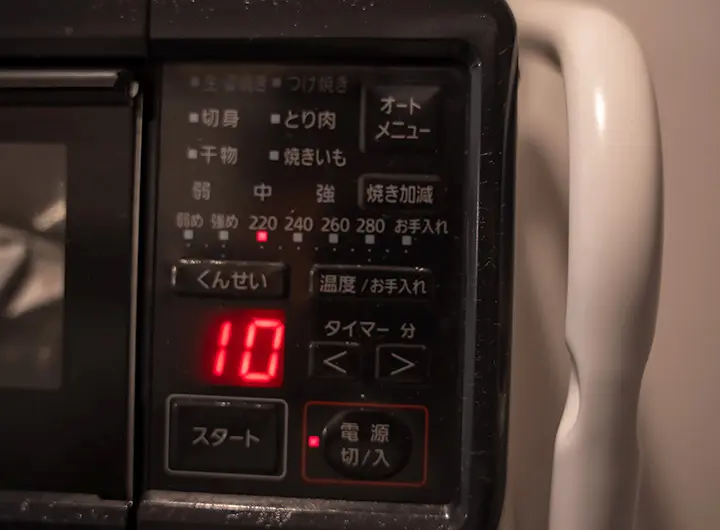 最初は温度は220度、時間は10分の手動設定でセットして焼いてみたら、焼き上がりはまだ芯に固さが残ってしまいました。焼き加減を見ながら調節しましょう。芋系や少し強めにグリルした方がいいかも。